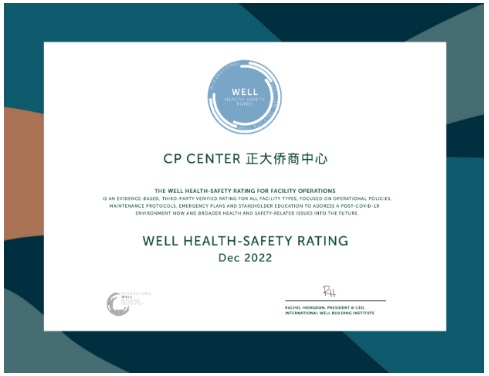 2022年12月,正大中心榮獲IWBI(國際WELL建筑研究所)授予的WELL HSR健康安全評價認證,成為中國首家采用數字化健康運行方式獲得WELL HSR認證的項目,也是目前北京獲得該項認證中,體量最大項目,既體現了正大中心項目運營的高標準,亦展現了正大中心的綜合運營實力和前瞻性視野。