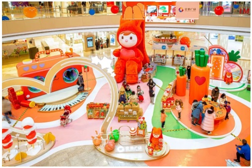 在上海九亭金地廣場,新年之際以巨型萌兔、毛絨絨、冬日為主要元素,打造了6m高的毛絨兔子、音樂錄音機(jī)、胡蘿卜鏡面森林等場景,溫暖治愈的場景讓消費(fèi)者感受生活的溫馨與美好。