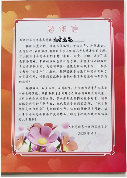 “廣大優(yōu)秀青年志愿者們秉持‘奉獻(xiàn)、有愛、互助、進(jìn)步’志愿服務(wù)精神,肩負(fù)責(zé)任與擔(dān)當(dāng)投身志愿服務(wù)活動(dòng),成為朝陽區(qū)一道道亮麗的風(fēng)景線、一張張生動(dòng)的‘金名片’。在此,朝陽團(tuán)區(qū)委向您們的突出貢獻(xiàn)予以高度認(rèn)可,對您們的無私付出致以最真摯的感謝和最崇高的敬意……”。日前,我愛我家青年志愿服務(wù)隊(duì)收到了一份來自北京市朝陽團(tuán)區(qū)委的感謝信。