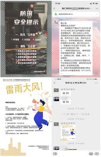 客服管家時刻關注當地氣象部門預警信息,通過業主微信群、公告欄、電梯前示等形式提前向業主發布溫馨提醒,同時加強項目空置房巡查,細致的貼心服務深受業主好評。