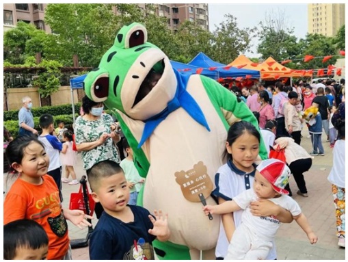 小區(qū)物業(yè)工作人員變身快樂大使,穿著今年最流行的網紅青蛙玩偶服裝,向業(yè)主派發(fā)氣球,吸引了眾多業(yè)主的目光,小朋友們興高采烈地圍著“青蛙”打轉,爭相與“青蛙”合影,現場充滿了歡樂氣息。