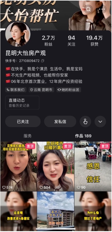 大怡(快手昵稱:昆明大怡房產觀,ID:2710809472)是快手理想家的一名房產主播,曾在北京幸運的趕上了房地產發展的黃金期,憑借成熟的業務經驗和大膽的投資手段,她年紀輕輕便沒有了財務壓力。