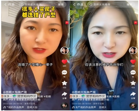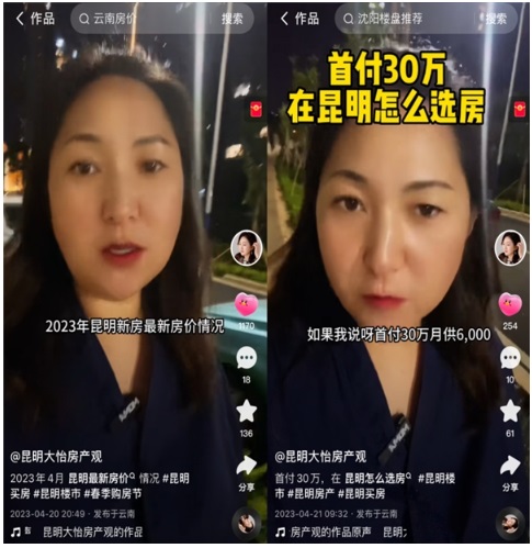 “直播賣房一看專業度,二看信任度。”如今,大怡已經形成了自己的短視頻內容規劃體系,一類屬于‘泛話題’,“房產畢竟是小眾內容,想要吸引更多潛在客戶,就需要具備更強的關聯性,比如最近淄博燒烤爆火,就可以通過‘淄博與昆明的相同和不同’為切入點進行一些解讀”;另一類是更為垂直的內容,地產的相關知識、房產稅等新聞事件的解讀等等。