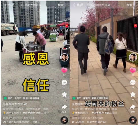 讓大怡感到榮幸的還有自己仿佛成了城市宣傳的窗口,“往小了說,我們的每天直播是為了賣房子,幫更多人找到理想家,但往大了說,直播能夠輻射到全國,在推薦房子的同時,也在宣傳宜居的昆明,介紹這里得天獨厚的氣候,適合旅行、康養的自然條件。我有70%的客戶都是從外省過來的,通過我們小小的主播就能促進城市人口的流入,這在以前是想都不敢想的,毫不夸張的講,快手真的改變了我的命運”。