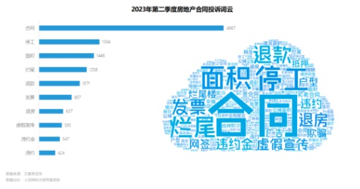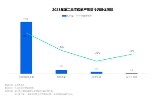 2023年第二季度,質量投訴中房屋及裝修質量相關投訴7769起,較去年同期增長9%;車位質量相關投訴523起,較去年同期下降15%;違章搭建、設計不合理相關投訴分別為288起、53起。