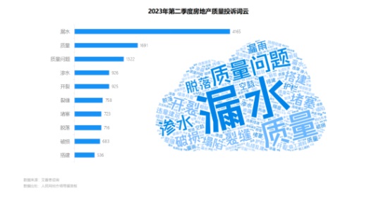 2023年第二季度熱度較高的房地產投訴事件有:青島市龍湖昱城房屋質量差、漏雨嚴重(11起)。