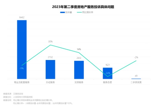 服務類投訴中,物業及配套服務投訴量8462起,較去年同期下降11%,其中物業不作為、亂收費、亂使用維修基金等問題投訴較多;辦證服務投訴量2732起,較去年同期增長30%,主要投訴問題為無法辦理房產證;交房服務投訴2612起,較去年同期增長14%,主要涉及延期交房;服務態度相關投訴1621起,較去年同期下降34%,工作人員辦事推脫、拖延相關投訴較多。
