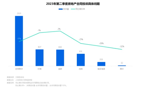 2023年第二季度,合同類投訴中合同欺詐投訴量2531起,較去年同期下降17%,主要涉及面積縮水、虛假宣傳等問題;爛尾投訴837起,較去年同期下降1%;退款投訴830起,較去年同期增長2%。違規、強買強賣、降價相關投訴較去年同期分別下降21%、26%、32%。
