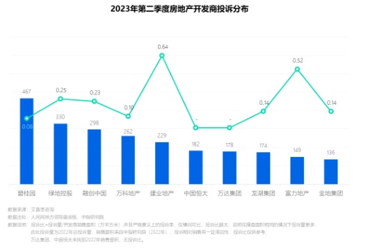 2023年第二季度,投訴量前五的開發商為碧桂園、綠地控股、融創中國、萬科地產、建業地產,其中建業地產投訴量較去年同期增長35%。結合銷售面積來看,碧桂園、萬科地產投訴比分別為0.08、0.10,遠低于前十平均值(0.30),聲譽表現較好;建業地產、富力地產投訴比持續偏高。
