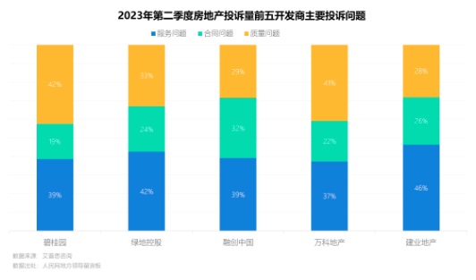 從投訴分類來看,2023年第二季度綠地控股、建業地產服務問題居多,占比均在40%以上;碧桂園、萬科地產質量投訴較多,占比分別為42%、41%。