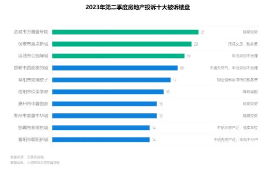 2023年第二季度被投訴最多的樓盤為武威市萬嘉壹號院,共收到投訴21起,主要投訴問題為延期交房。