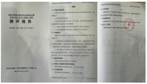 記者查閱到一份由陜西省建筑工程質(zhì)量檢測中心有限公司出具的編號(hào)陜建筑(2023)技服(政)第0010號(hào)的《測評報(bào)告》。報(bào)告顯示,DK8所建4棟樓房的房屋外墻、門窗、消防設(shè)施及所使用的電線電纜、水暖工程等均為不合格工程,使用的材料均為不合格和不達(dá)標(biāo)的材料。