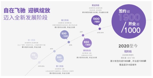 2016年初,麗楓酒店開業門店破100,正式進入“百店時代”。僅一年時間,迅速沖破200家,簽約500+個項目。2018-2019年,麗楓酒店開業破650家,簽約項目超1300家;2020-2023年,麗楓酒店抵達“千店”里程碑,成為超3000萬人次出行的優質選擇。