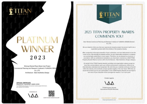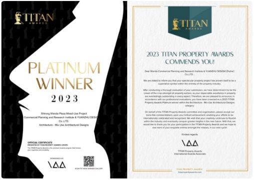2023美國TITAN最佳商業綜合體建筑設計鉑金獎證書及獲獎函