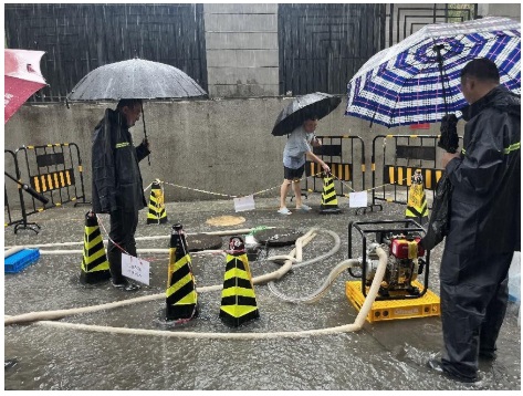 物業人員冒著大雨緊急用水泵抽水、排水。