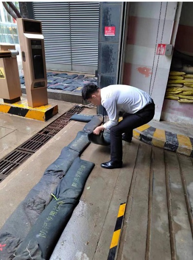 秩序人員在地庫出入口穩固防汛沙袋,守護業主的生命財產安全。