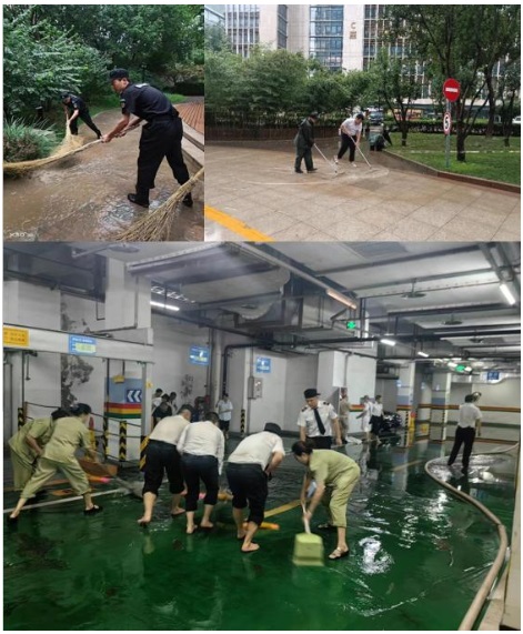 物業人員正在全力清掃路面和地庫積水,保障業主出行安全。