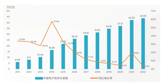 2022年,中國電子商務交易額達到43.83萬億元人民幣,同比增長3.5%,此前一年增長19.6%。