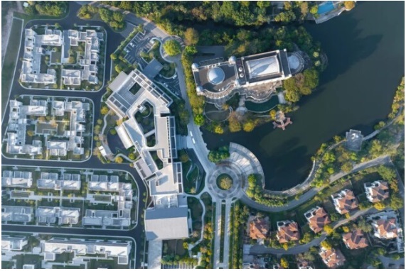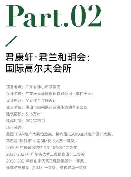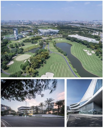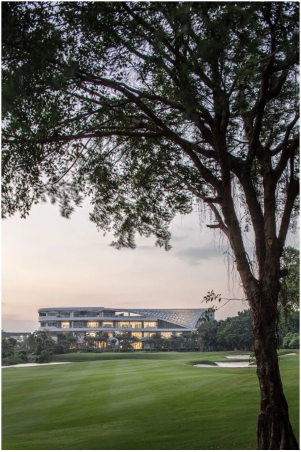 用地一側為天然水道,自然環境優美,建筑順地勢而起,與高爾夫球場綠茵完美結合。建筑用現代化的空間語言,充分利用場地360度景觀資源,通過設計回歸自然,建筑外觀舒展、柔和、通透、宜人,層次豐富。