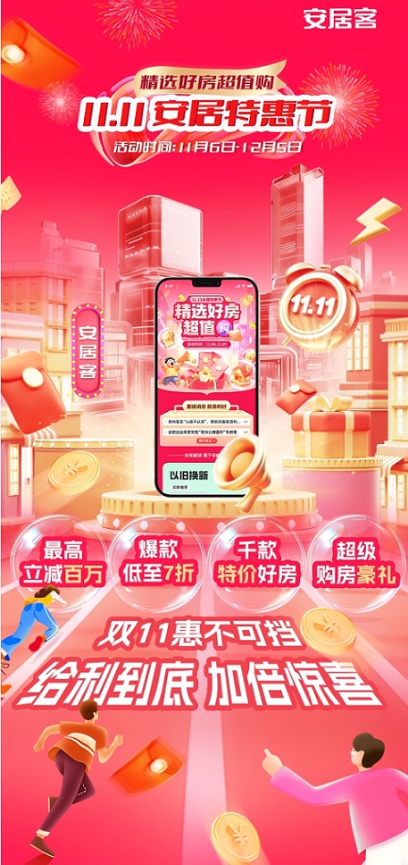 一年一度的雙十一購(gòu)物狂歡季如約而至, 在 2024 全國(guó)樓市新政利好的大背景下,58同城、安居客積極響應(yīng)市場(chǎng)需求,重磅推出 “11.11安居特惠節(jié)”(以下簡(jiǎn)稱(chēng)安居特惠節(jié));顒(dòng)從11月6日至12月5日,持續(xù)一個(gè)月鉅惠不斷,攜手全國(guó)百家品牌開(kāi)發(fā)商,打造“精選好房超值購(gòu) ”的購(gòu)房置業(yè)狂歡季。安居客作為國(guó)內(nèi)領(lǐng)先的房產(chǎn)服務(wù)平臺(tái),一直以來(lái)都致力于為客戶(hù)提供優(yōu)質(zhì)全面的房產(chǎn)服務(wù)。此次的安居特惠節(jié),更是充分發(fā)揮平臺(tái)優(yōu)勢(shì),整合各方資源,匯聚海量?jī)?yōu)質(zhì)房源,為購(gòu)房者打造一場(chǎng)優(yōu)惠力度拉滿(mǎn)的房產(chǎn)盛宴。