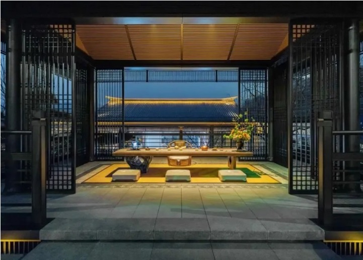 建筑上也同樣遵循營造法式,將歇山頂、懸魚、掛落、美人靠等細部轉譯,呈現中國建筑的東方意境之美 。