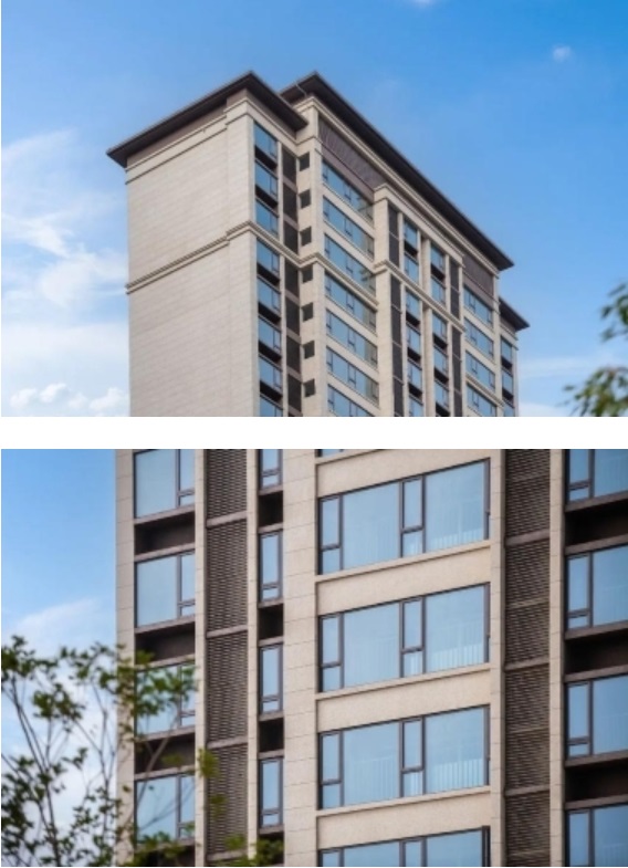 項目立面采用大面積灰藍色low-e中空玻璃+真石漆的運用,入戶首層局部采用黃金鉆石材,勾勒出輕盈典雅的質感,呈現優雅的比例和尺度。