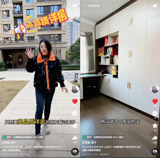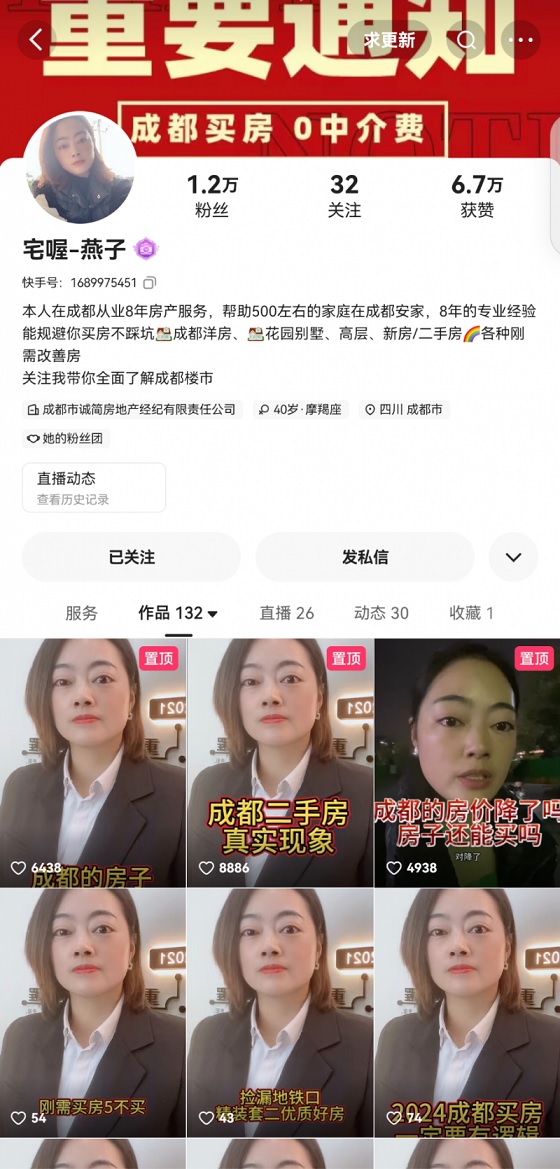 2023年10月,燕子正式轉行成為房產主播,燕子通過@宅喔-燕子的快手賬號,兩個月成交3套房產,GTV超過300萬,收獲了超萬名快手老鐵的信任。