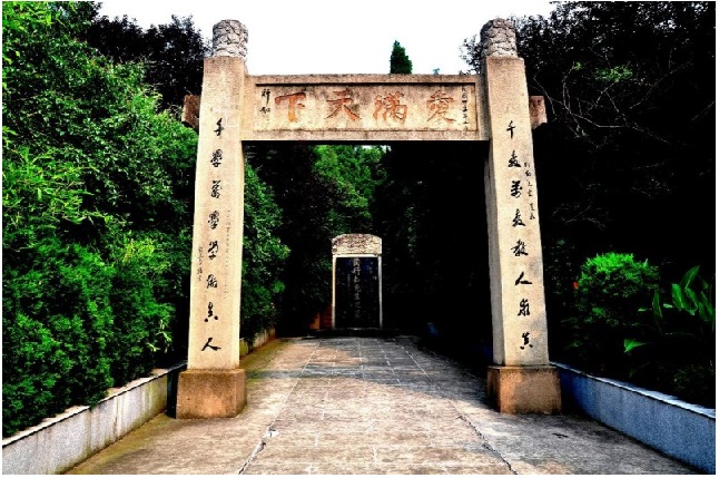 陶行知先生是我國偉大的人民教育家,1927年與人合辦南京市試驗鄉村師范學校即曉莊師范,1946年去世,葬于曉莊。陶行知墓位于勞山下,墓前有牌坊、墓碑等,牌坊橫額上刻有陶行知書“愛滿天下”,坊柱有楹聯:千教萬教教人求真,千學萬學學做真人。這是陶行知先生最著名的教育箴言之一。是說要實實在在求學問,坦坦蕩蕩去做人。教育最重要的目的是培養人,這個人,應該是追求真理,擁有真性情、真情懷的人。