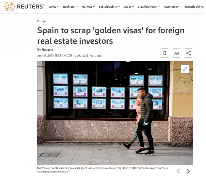 當地時間4月8日,西班牙首相桑切斯毫無預警地宣布,政府將終止面向非歐盟購房者的“黃金簽證”計劃。