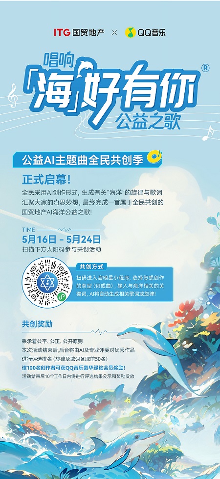 5月16日,作為國貿(mào)地產(chǎn)海洋公益月重要活動之一,由國貿(mào)地產(chǎn)攜手QQ音樂舉辦的“海好有你 國貿(mào)地產(chǎn)公益AI主題曲全民共創(chuàng)季”正式啟動。登錄線上專屬平臺進行海洋公益詞曲AI創(chuàng)作、分享,并基于共創(chuàng)內(nèi)容定制一首主題曲全網(wǎng)發(fā)布……