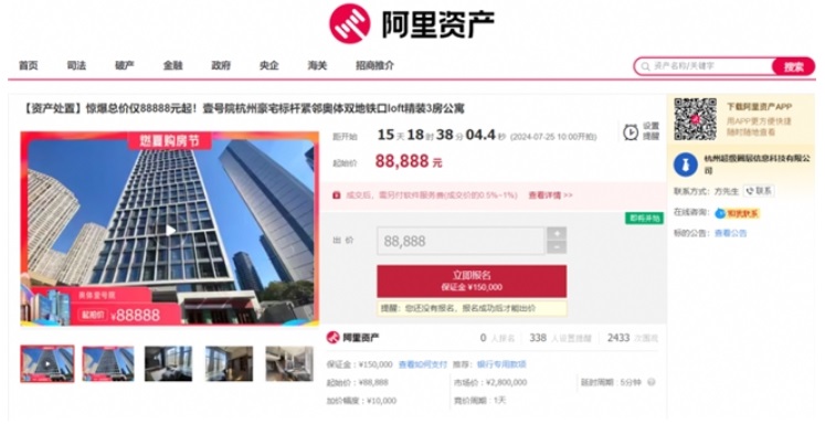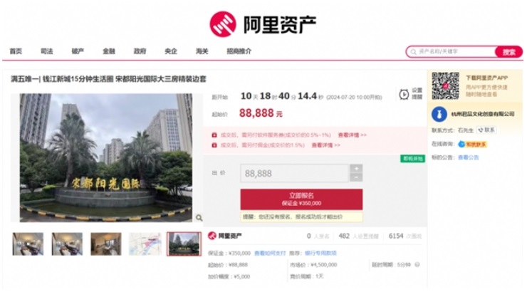 該標的起拍價88888元,將于7月25日在阿里資產房產平臺開拍,參拍需繳納保證金35萬元,加價幅度為5000元或整倍數。