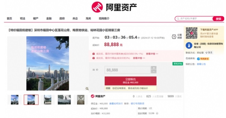 該標的起拍價88888元,將于7月25日在阿里資產房產平臺開拍,參拍需繳納保證金6萬元,加價幅度為10000元或整倍數。