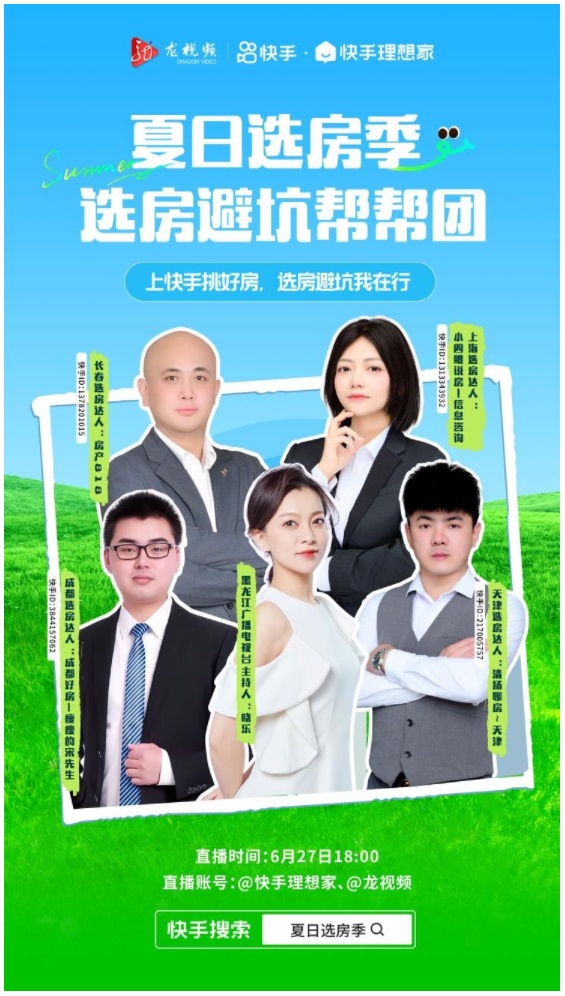 此次直播以夏日選房季活動(dòng)為背景。6月,快手理想家聯(lián)動(dòng)開(kāi)發(fā)商、機(jī)構(gòu)和主播發(fā)起夏日選房季活動(dòng),為購(gòu)房者帶來(lái)購(gòu)房?jī)?yōu)惠和優(yōu)質(zhì)房源。參與直播的四位房產(chǎn)主播分別來(lái)自長(zhǎng)春、成都、天津、上海,遍布一線城市、新一線二線城市。