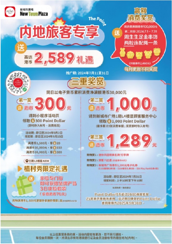 最硬核的當(dāng)屬暑期檔香港沙田新城市廣場特別策劃推出的「The Point 暑假旅客」內(nèi)地旅客專享三重獎賞計(jì)劃,高達(dá)港幣2,589禮遇,消費(fèi)滿30,000港幣即可獲得額外三重禮加贈,福利超多,誠意滿滿。