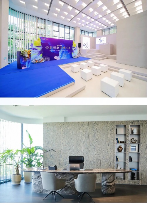 項目領(lǐng)導(dǎo)陪同來訪嘉賓一同參觀了樣板間。踏入樣板間,仿佛穿越到未來的商務(wù)辦公場景之中。約7.2米挑高首層大廳,以企業(yè)名片般的首道空間呈現(xiàn),讓來訪者直觀感受到企業(yè)的實力;辦公區(qū)內(nèi)靈活多變的交流空間、綠色生態(tài)的辦公空間,以人文色彩賦予商務(wù)空間不一般的體驗;緊隨時代潮流打造的直播間、實驗室,開拓了企業(yè)展示自我的新平臺;獨立總裁層,規(guī)劃辦公室、會議室、茶室等功能空間,隨時開啟商務(wù)會晤……從空間布局到創(chuàng)新設(shè)計,每一處設(shè)計都蘊含著匠心巧思,無一不透露著對未來商務(wù)空間的創(chuàng)新引領(lǐng)。這也引得參觀者紛紛駐足,無不贊嘆設(shè)計師的巧妙構(gòu)思與項目的非凡品質(zhì)。