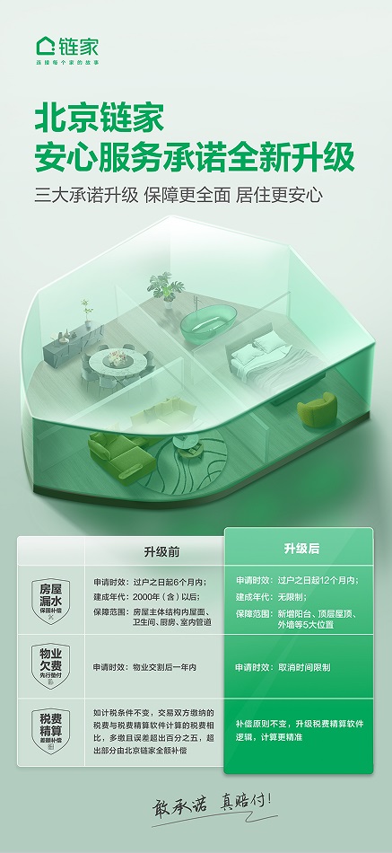 為進一步滿足當前消費者的實際需求,近日,北京鏈家安心服務承諾進行全新升級。針對“房屋漏水 保固補償”、“物業欠費 先行墊付”、“稅費精算 差額補償”三項條款,進一步擴大保障范圍,延長保障時效,加大保障力度,以破解消費居住中面臨的真實痛點。