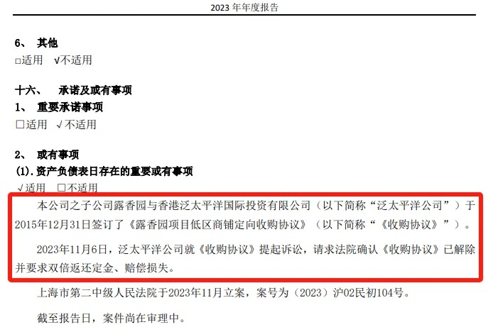 雖然目前官網(wǎng)上尚未披露案件詳情,但從上海城投2023年年報也能窺得一二。據(jù)其年報,2015年,上海城投就露香園低區(qū)商鋪與香港泛太平洋國際投資有限公司(以下簡稱“泛太平洋公司”)簽訂《露香園項目低區(qū)商品定向售樓協(xié)議》(以下簡稱“收購協(xié)議”),2023年11月,泛太平洋公司就《收購協(xié)議》提起訴訟,要求法院確認(rèn)《收購協(xié)議》已解除,并要求雙倍返還定金、賠償損失。