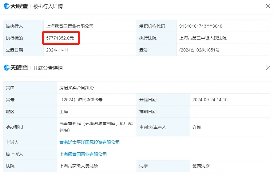 2024年底,露香園項目公司上海露香園置業(yè)有限公司(以下簡稱“露香園置業(yè)”)成為被執(zhí)行人,執(zhí)行標(biāo)的高達(dá)5777萬元。
