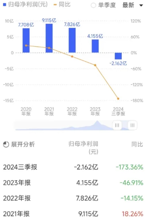 據(jù)上海城投旗下上市主體城投控股年報,從2021年至今,城投控股歸母凈利潤連年下降,尤其到了2024年,其歸母凈利開始虧損,三季報顯示,城投控股虧損額2.162億元,同比下跌173.36%。
