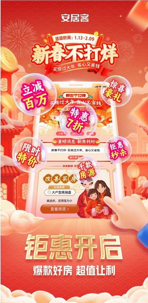 春節(jié),是中華民族每年最重要的傳統(tǒng)節(jié)日,也是游子歸鄉(xiāng)、闔家團(tuán)圓的溫馨時(shí)刻,人們對(duì)于家的渴望愈發(fā)強(qiáng)烈,購房置業(yè)的需求也隨之高漲。為了滿足廣大購房者在春節(jié)期間的購房需求,58同城、安居客特別推出“新春不打烊”活動(dòng)。活動(dòng)從1月13日至2月9日,旨在搭建一個(gè)便捷、高效的購房渠道,讓購房者在春節(jié)期間能夠輕松選房、安心購房,實(shí)現(xiàn)新春置業(yè)夢(mèng)想,開啟幸福新生活。