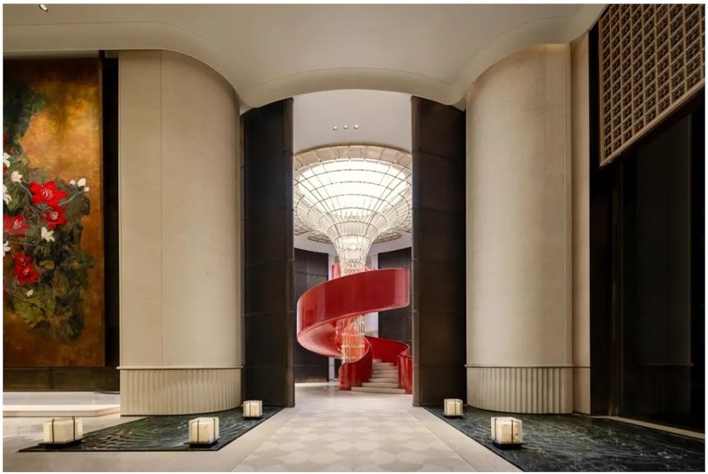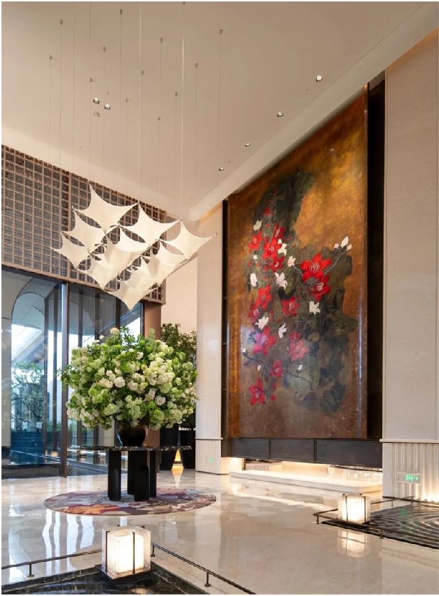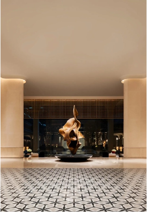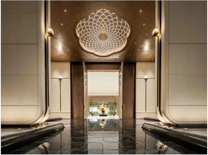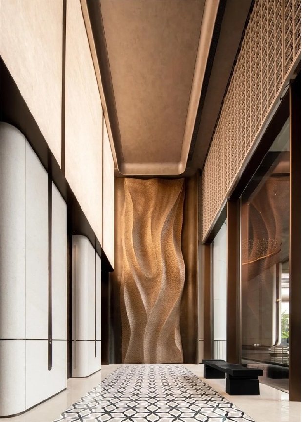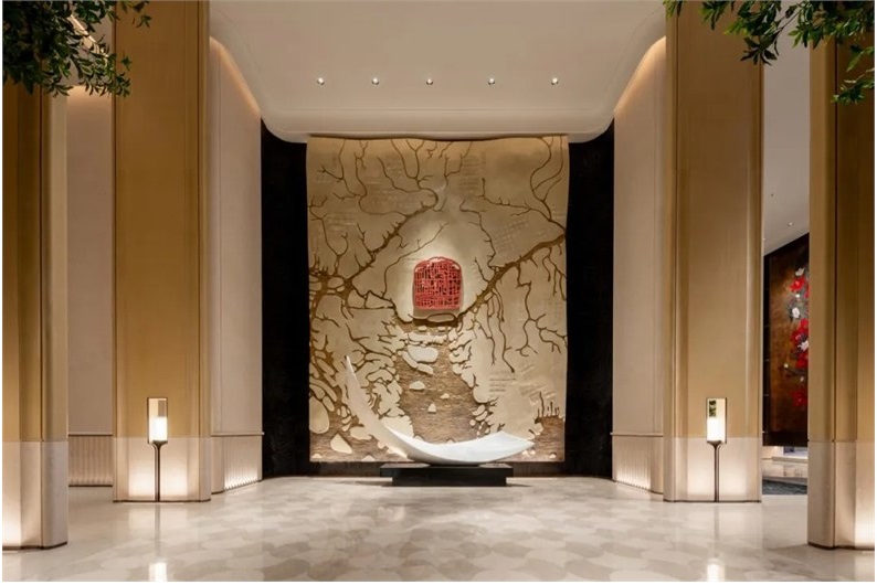 “非遺銅門”|約7.5米高的“非遺銅門”,是由中國國寶級非遺大師朱炳仁首創。在大門蝕刻工藝的基礎上刻畫生命之樹,銅門兩側融合了非遺錘紋鍛造工藝;門把手采用掐絲琺瑯與鏨刻工藝。