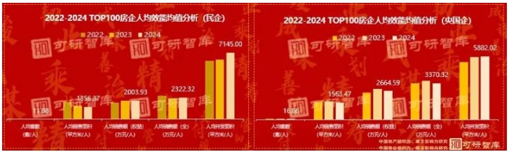 TOP100房企大部分效能數據均值下降,2024年TOP100房企人均全口徑銷售額均值3200萬,人均權益銷售額2300萬,元均權益銷售額58.9元,民營企業部分數據出現探底狀態。