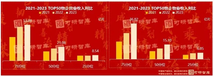 2023年,TOP50 物企的項均營收與物收分化特征顯著,頭部企業增長勢頭迅猛,而后位企業的增幅逐漸放緩。物企品牌效應的優勢在這一過程中展現得淋漓盡致,這與 2022 - 2023 年可研智庫所倡導的構建物企品牌成熟度發展策略高度吻合。