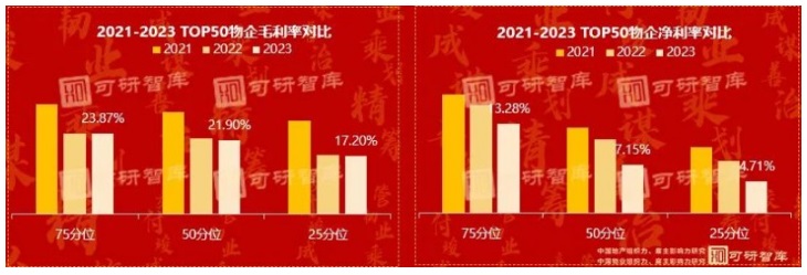 2023年,物企面臨著較大的盈利能力挑戰,毛利率持續走低,TOP50 物企的毛利中位值穩定在 16.8%,凈利率也緊隨其后持續下行,中位值為 7.15%。