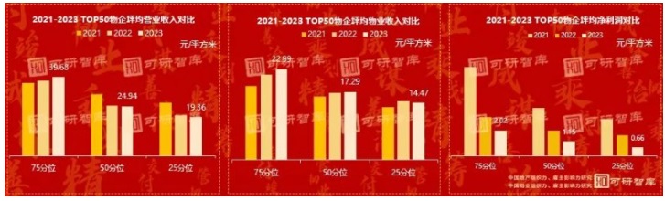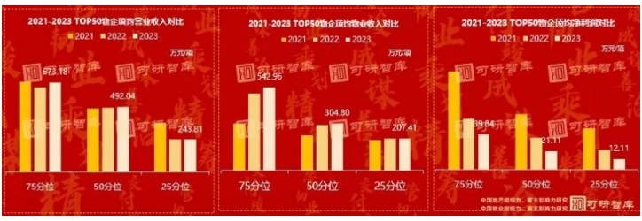 與人效及元效上升趨勢不同,TOP50物企的坪均產出出現了不同程度的分化,頭部企業坪均營收及坪均物收持續保持增長。之所以出現分化,或與近兩年大量企業向市場化項目拓展有關。在激烈的競爭中,新簽與續簽項目都出現了價格下行挑戰。那么從利潤視角,考核與激勵是否可以向更加精細化的關注項目上的服務價格延續或提升出發去設計,從而減緩過度以利潤為考核視角下的服務品質下降的問題隱患,值得思考。