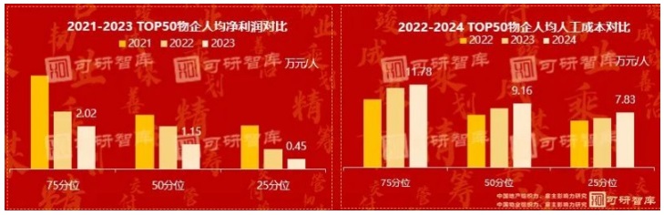 2023年,TOP50 物企的人均凈利潤進一步下滑,降幅波動受到諸多因素的交互影響,包括服務定價、設備維護周期、員工規模增長、社保調基、自持與委外人員比例等。近兩年來,TOP50 物企廣泛采用分級分類的管控模式以及項目配置策略,同步積極探索片區統籌管理模式,聯合品控部門強化供應商管理能力等多種調節手段,力求改善現狀。