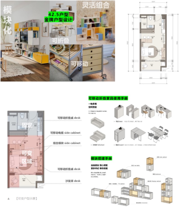 項目將實行統一的交付標準,根據設計指標,我們引入了折疊、移動及模塊化家具的概念,這些家具元素共同構成了一個靈活可變的區域系統。該系統允許租戶根據自己的使用習慣和具體場景需求,自由地進行DIY設計,從而打造出專屬于自己的個性化生活空間。