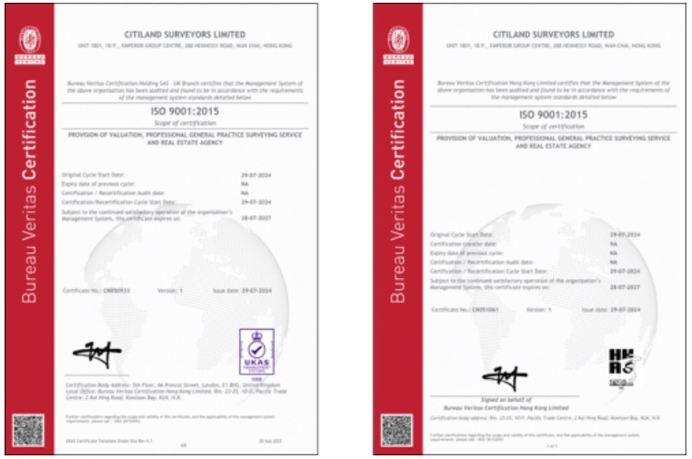 「天俊測量師行」以提供優質服務為目標,致力于培養團隊嚴謹的工作態度與專業水平,制定高標準的運營程序與規范,力求超越客戶的要求和期望,成為客戶首選的專業測量師行。公司的估值、產業測量及物業代理服務已成功通過ISO 9001:2015國際質量認證,獲得香港認可處(HKAS)和英國認可局(UKAS)等頒發的國際認證,標志著「天俊測量師行」持續提供高質量服務與管理系統,深受各界認可。