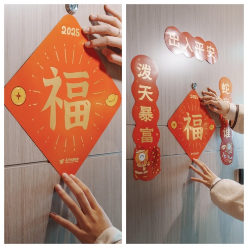 越秀星廷精心打扮美好星裝,粘春聯貼窗花,布置新年盆花,入門新春組景,懸掛蛇年拉花,裝扮紅包發財樹,用心營造新年浪漫,祈愿每一位星友租戶們,都能在新的一年里被好運與幸福緊緊圍繞。