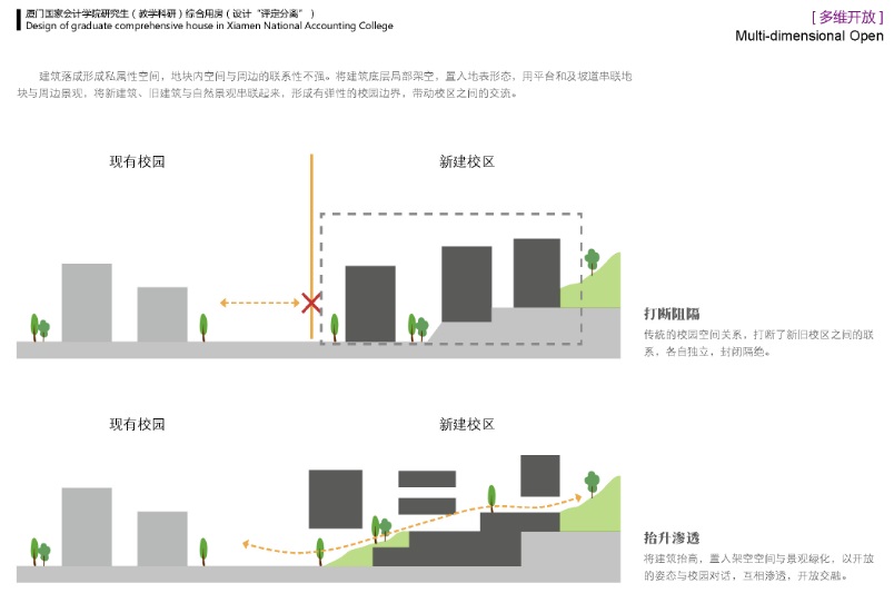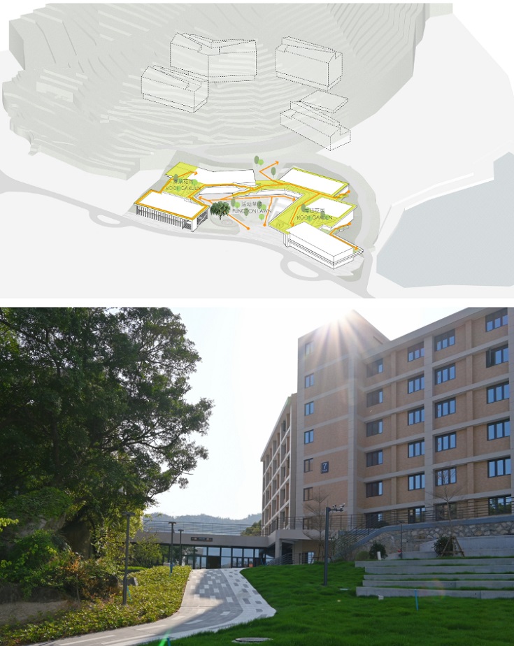 項目基地位于學院北側,背靠山體,東臨軍民水庫,地形高差顯著。項目團隊巧妙利用原有地貌,將建筑“鑲嵌”于山體之中,采用南高北低、西高東低的圍合式布局,既有效減少對周邊景觀的視線干擾,又最大化保留山體與植被。場地內古榕樹、巨石等歷史印記被完整保留,形成承載共同記憶的中心庭院,結合下沉廣場、屋頂平臺、立體連廊等空間,構建出多層次綠化景觀系統,完美詮釋“建筑生長于自然”的生態理念。
